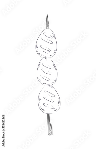 Vector black and white illustration of a Japanese kebab on a skewer. Asian cuisine wallpaper for menu, packaging, cafe, restaurant.