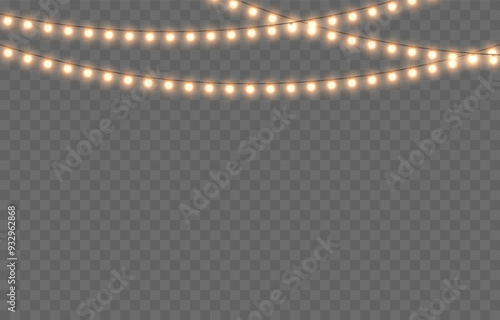 Vector Christmas garland png. Christmas light png. Holiday decoration, garland with golden lights, LED lamp.