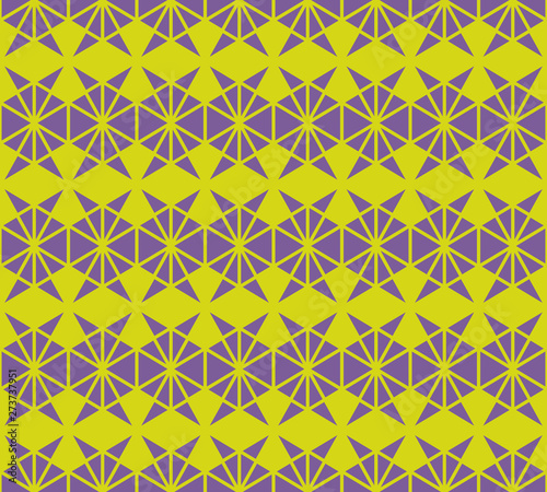 Vector geometric seamless pattern with triangles, hex grid. Green and purple