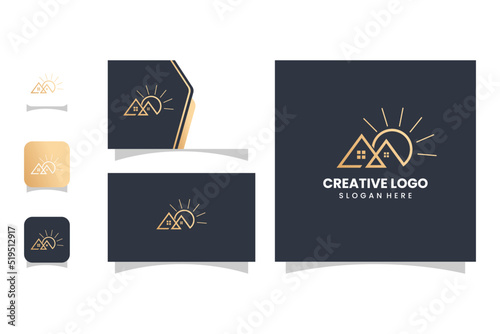 Vector graphic of home and sun logo with line art style, suitable for real estate and travel companies or hotels