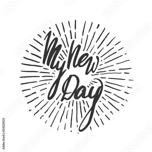 Vector handwritten brush script. Black letters isolated on white background. My new day with burst