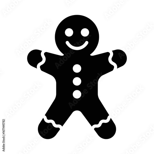 Vector icon of simple black silhouette of a gingerbread man with white details, isolated on a