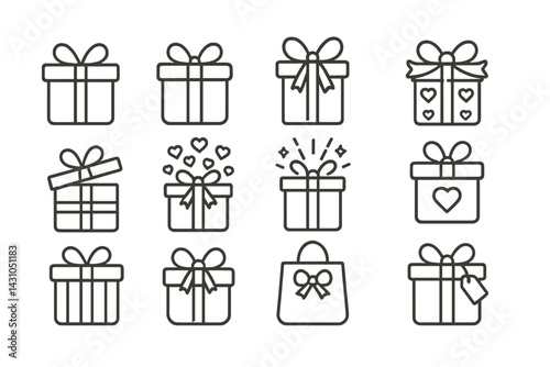 Vector icon set featuring gift boxes in various designs and styles for celebrations, packaging, and events