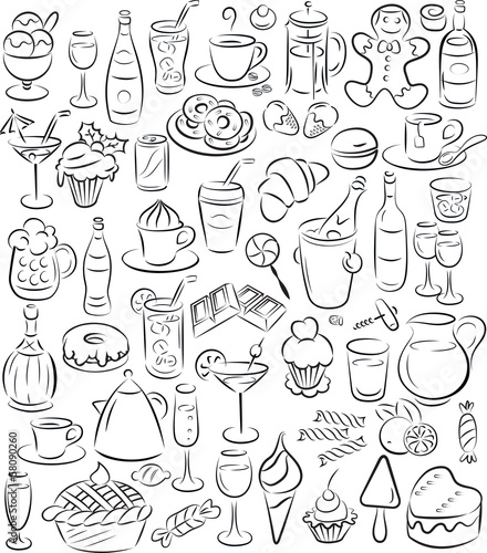 sweet food, drink, tea, mug, pie, wine, beer, cake, tart, soda, snack, candy, donut, cream, water, sirup, hot drink, symbol, sorbet, vignetting, pastry, cognac, cupcake, outline, dessert, alcohol, biscuit, whiskey, parfait, martini, liqueur, crockery, cocktail, macaroon, lollipop, chocolate, champaign, margarita, croissant, apple pie, ice cream, milkshake, hand-drawn, orange juice, pencil drawing, chocolate candy