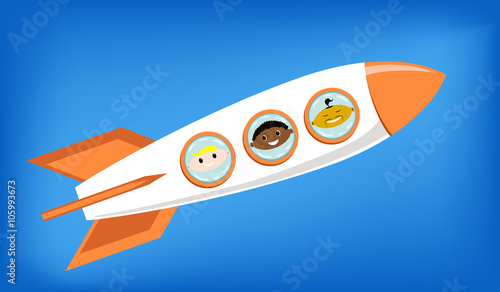 rocket, vector, space, cartoon, astronaut, adventure, spaceship, steel, white, travel, astronaut, tech, technology, illustration, take-off, sky, cockpit, alloy, flight, universe, fly, happiness, african, asian, people, friendship
