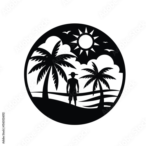 palm, beach, tree, tropical, summer, vector, island, sea, sun, illustration, nature, travel, silhouette, ocean, landscape, vacation, sunset, sky, holiday, water, design, sand, palm tree, paradise, coconut