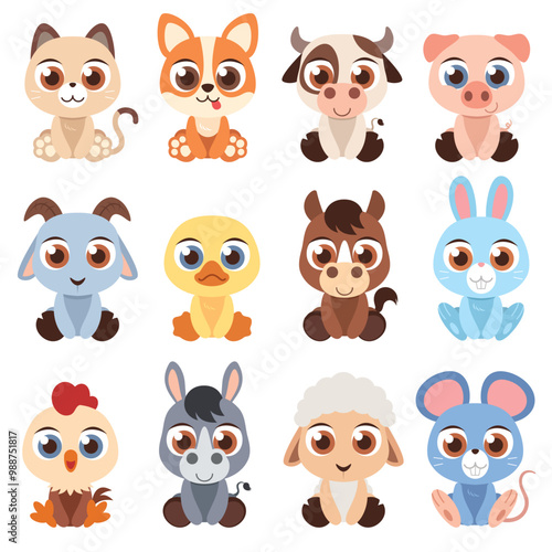 Vector illustration of Cartoon Cute Farm Animals Sit Character Set