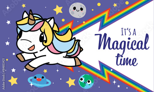 Vector illustration of Cute cartoon happy unicorn flying on universe with star, night background ,rainbow power, flat design , sweet color for kids isolated vector objects , greeting card