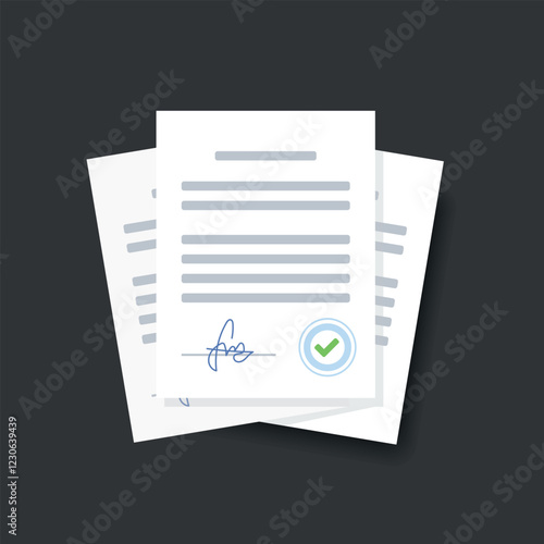 Vector illustration of stack of contract documents, flat cartoon package of agreement documents with signature and approval stamp, document design concept, business icon on isolated background