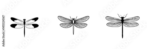 Vector illustration of three distinct dragonfly designs showcasing intricate line work and varying wing patterns