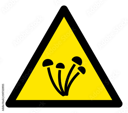 Vector mushrooms flat warning sign. Triangle icon uses black and yellow colors. Symbol style is a flat mushrooms attention sign on a white background. Icons designed for careful signals, road signs,