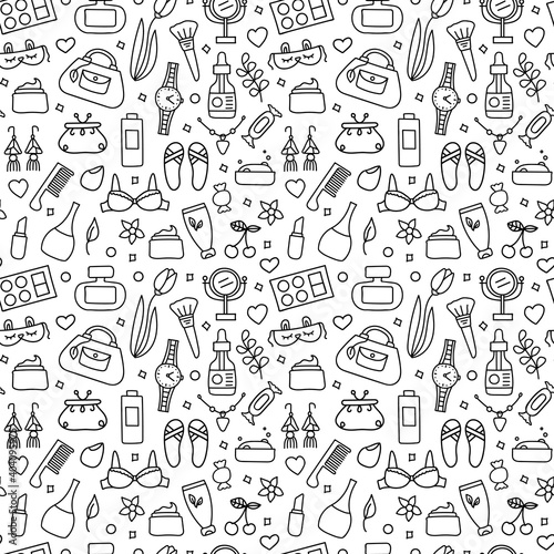 pattern, beauty, seamless, doodle, cosmetic, vector, make up, fashion, woman, vignetting, tool, female, feminine, girl, line, outline, hand-drawn, accessory, textile, wallpaper, wrapping, element, care, background, bag, bra, brush, cartoon, cute, design, fabric, graphic, icon, illustration, isolated, lipstick, look, object, paper, print, product, salon, serum, set, shoe, skin, spa, symbol