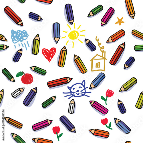 vector seamless pattern with lot of colored pencils and cute childlike doodles
