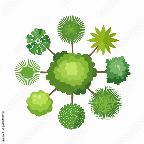 Vector set of tropical green tree top view isolated on white background for landscape and architecture drawing, elements for environment and garden