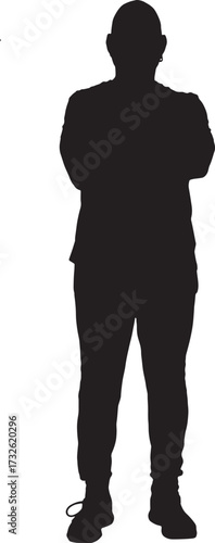 vector, silhouette of a front view of a man standing dressed in sportswear arms crossed