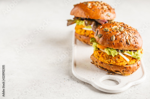 Vegan sweet potato (or pumpkin) burgers on white background. Vegetable burgers, avocado, vegetables and buns, copy space.