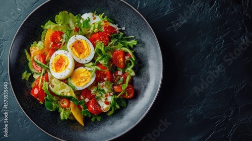 Vegetable salad with boiled egg and green onion. On a black stone background. In a plate, close-up.