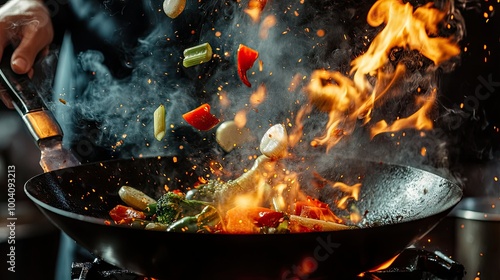 Vegetables flying from a hot wok as flames shoot up, captured in motion with a chef's hand visible, dark background emphasizing the fiery cooking action.
