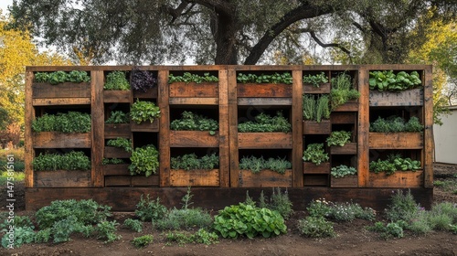Vertical Garden Structure with Wooden Shelves Showcasing Various Green Leafy Herbs and Plants in a Serene Outdoor Setting Surrounded by Trees