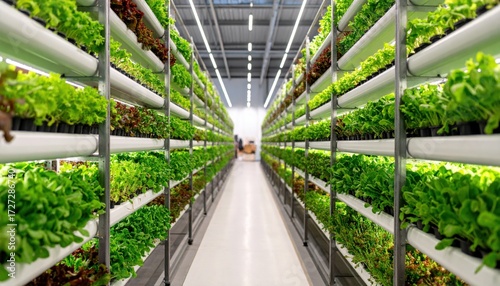 Vertical Hydroponic Farm with Rows of Leafy Greens