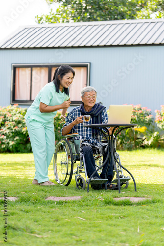 Vertical image of Asian nurse woman stand beside to take care senior man hold a glass of tea and sit on wheelchair also relax with watch the laptop in the garden.