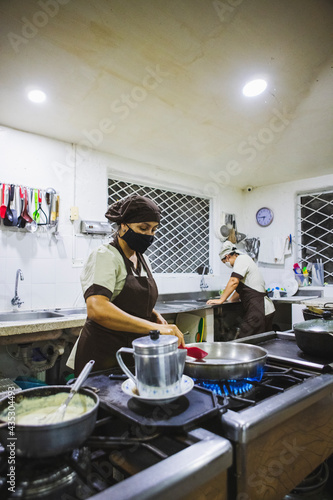 vertical, hispanic, woman, cook, kitchen, food, meal, work, spoon, background, hand, healthy, preparation, kettle, gas, mask, cookery, wall, bowl, sink, light, dish, delicious