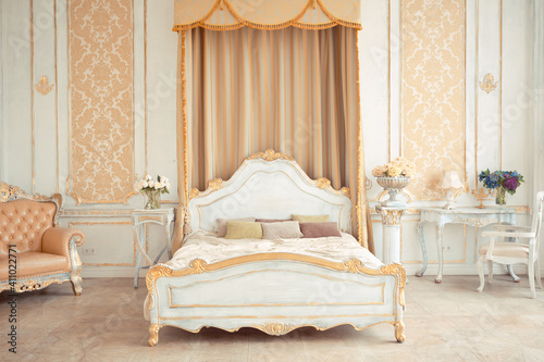 very rich interior of the apartment with golden decorations on the walls in the Baroque style and luxury furniture with gold paint.