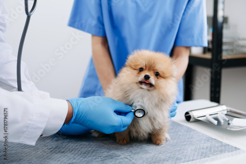 Veterinarian examining cute Pomeranian puppy in pet clinic using stethoscope, symbolizing professional veterinary care, pet health, and animal wellness.