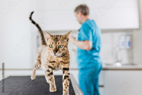Veterinarian in blue scrubs checks a cat on an exam table in a modern veterinary clinic for a routine health examination.