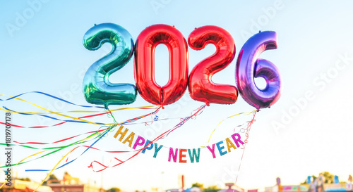happy new year, new year, celebration, balloon, ribbon, sky, future, year, annual, event, festive, vibrant, bright, hope, holiday, greeting, party, joy, countdown, anticipation, calendar, milestone, date, metallic, shiny, colourful, streamer, banner, number, blue skies, daytime, success, prosperity, growth, resolution, tradition, occasion, congratulation, light blue, teal, red, purple, floating, optimism, achievement