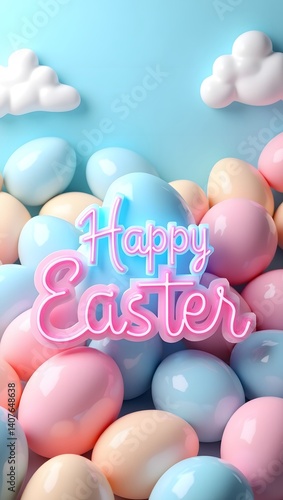 Vibrant 3D Easter vertical background with layered pastel egg motifs, abstract floral accents, and dynamic lighting for festive holiday designs