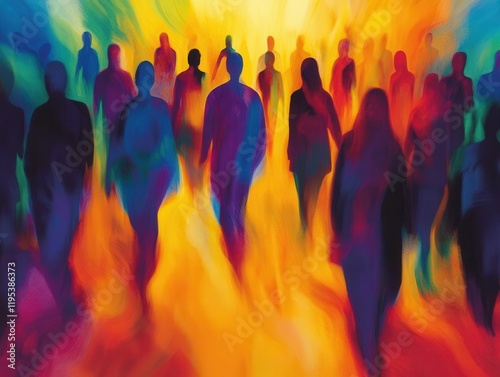 vibrant abstract crowd illustration dynamic multicolored silhouettes flowing together in organic motion creating a living tapestry of human connection