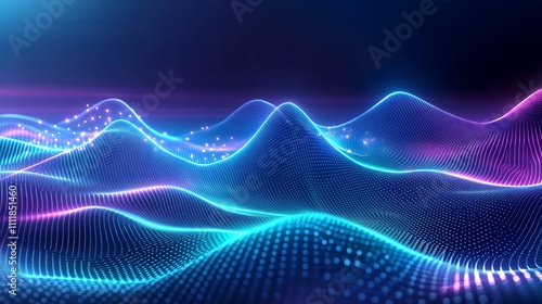 Vibrant Abstract Digital Waves in Blue and Purple Shades with Glowing Particles in a Dark Background