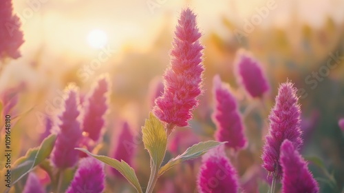 Vibrant amaranth flowers in soft focus, illuminated by warm sunlight, creating a serene and colorful blooming field at dusk.