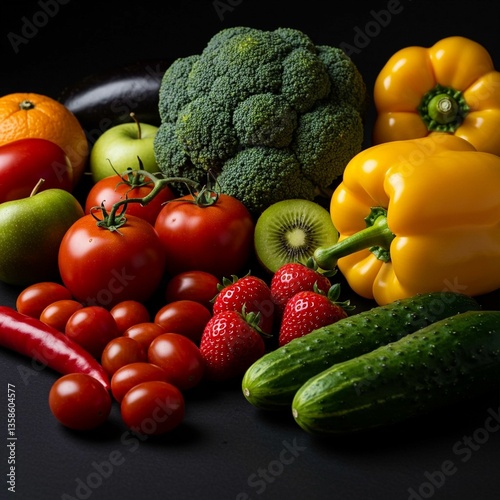 fruit, vegetable, tomatoes, broccoli, bell pepper, fresh, colourful, healthy, organic, kiwi, strawberry, cucumber, produce, dark background, ai, generative, illustration, digital, art