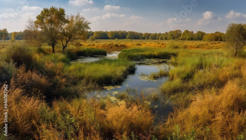 Vibrant autumn landscape yellow leaves, blue sky, tranquil meadow, serene pond generated by AI