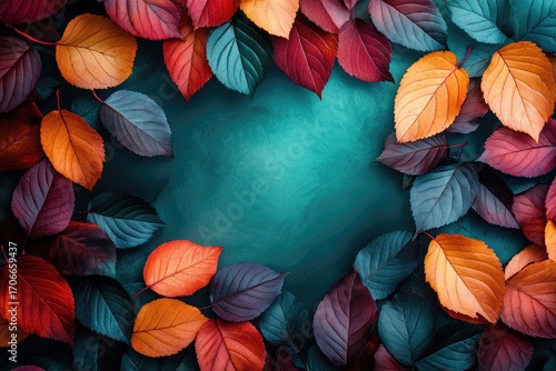 Vibrant autumn leaves in rich reds, oranges, and purples create a stunning frame on a teal background.