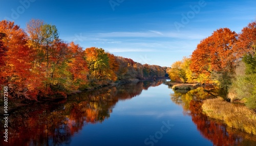 Vibrant Autumn River Landscape Fall Foliage Reflected in Calm Waters