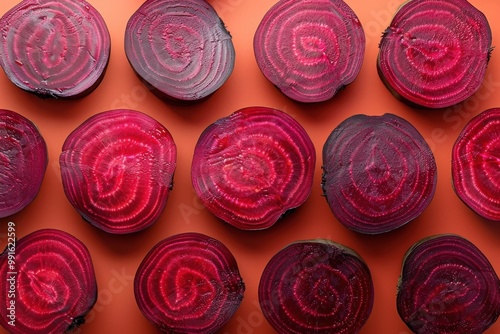 Vibrant Beetroot Slices: A captivating pattern of fresh beetroot slices arranged on an orange background, showcasing their rich burgundy hues and intricate patterns.