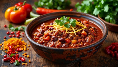 Vibrant chili con carne dish served in a rustic bowl with fresh ingredients and colorful spices