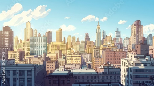 Vibrant City Skyline at Sunset with Colorful Buildings and Cloudy Sky