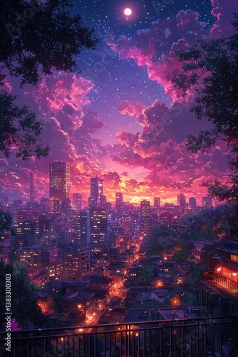 city landscape, dusk, urban, skyline, star, city lights, twilight, evening, night, digital artwork, cloud, glow, serenity, vibrant, street light, tower block, peaceful, horizon, calmness, metropolis, starry sky, scenic view, silhouette, dreamland, aesthetic