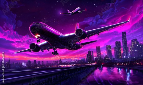 Vibrant Cityscape with Airplanes in Night Sky Under Colorful Clouds