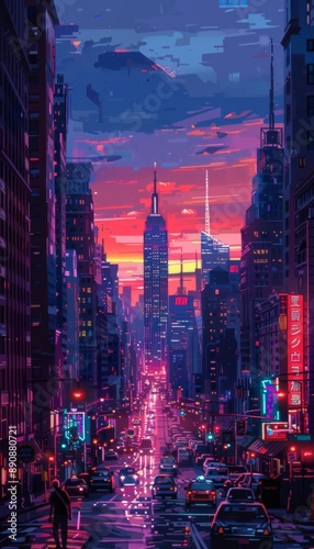 Vibrant cityscape with towering skyscrapers under a colorful sunset sky, neon lights illuminating the bustling street below.