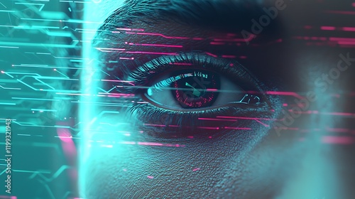 Vibrant close-up of an eye surrounded by flowing, glowing data streams in a cyberpunk-style high-tech ambiance
