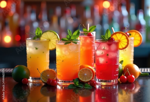 vibrant cocktail garnishes colorful aesthetic bar counter fresh ingredients lime mint cherry orange garnish creative, glass, fruit, herb, citrus, drink