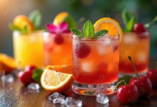 vibrant cocktail garnishes colorful fresh fruit herbs ice table arrangement refreshing beverage decor, orange, lemon, basil, cucumber, berry, mint, slice, pineapple