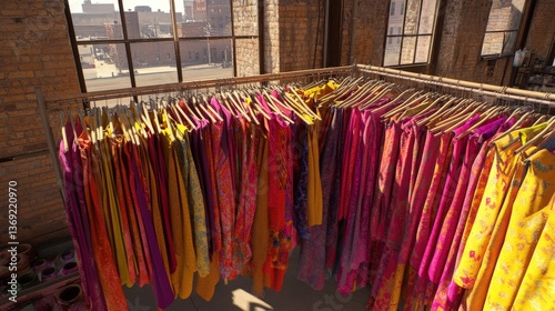 Vibrant collection of colorful fabrics hanging on a rack in a sunlit loft space. Perfect for fashion, textile, and design projects.