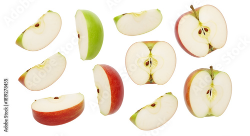 Vibrant collection of fresh apple slices and halves showcasing diverse green and red fruit varieties scattered against a clean backdrop perfect for healthy eating concepts and natural food photography