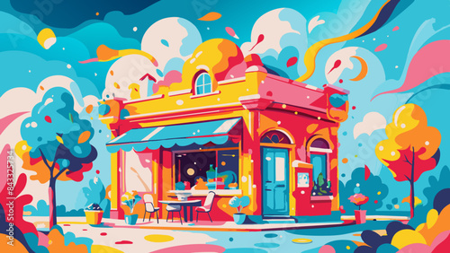 Vibrant Colorful Cafe Illustration with Surreal Sky